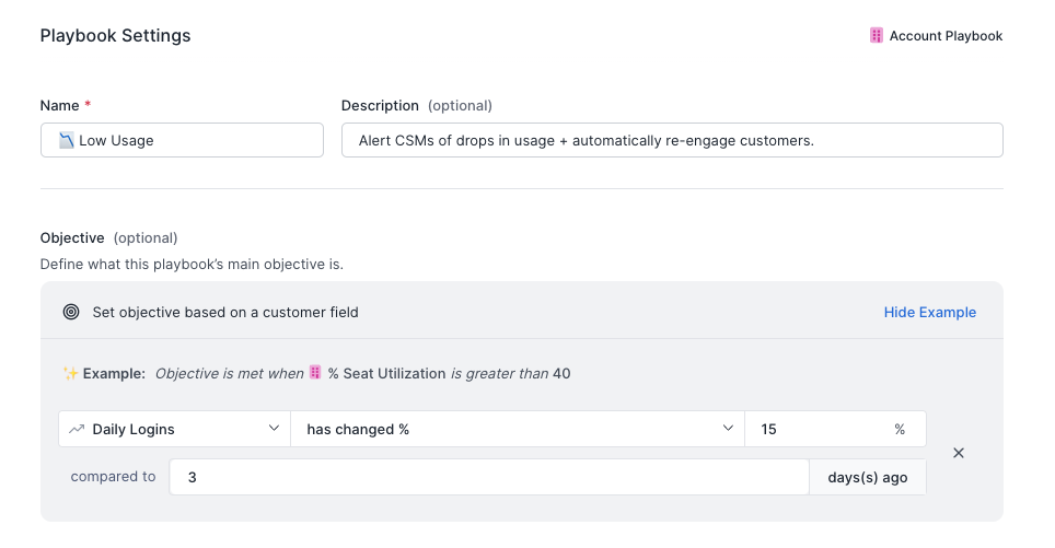 With Playbook Objectives, you can measure what is actually moving the needle for customers, by defining a target metric for each one of your processes. Double-down on what is working, iterate on what is not, and show ROI to your peers and leadership team.