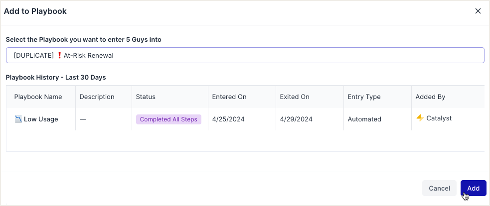 Playbooks are pre-built workflows that automatically assign new tasks, send personalized emails, and update field values. When a customer qualifies for a playbook, typically based on custom criteria, Catalyst applies the automated actions and branching logic defined in the workflow. If the playbook creator allowed manual entry, you can add customers to a playbook on-the-fly—even if the customer doesn't meet the playbook entry criteria.