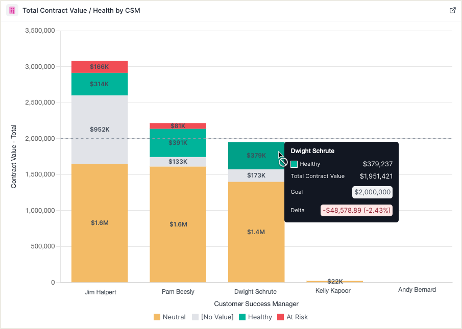 - ARR Risk Assessment: Create intuitive bar graphs to display your Total ARR by Renewal Date, segmented by Health. Use these insights to identify at-risk ARR, enabling prompt and targeted intervention strategies.