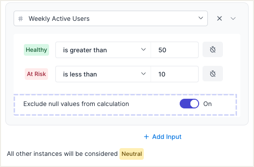 Previously, if a customer input didn't qualify for a Healthy or At Risk threshold due to missing data, the calculation would score that input as Neutral. This adjustment provides a much more precise result when a data point is simply not available.