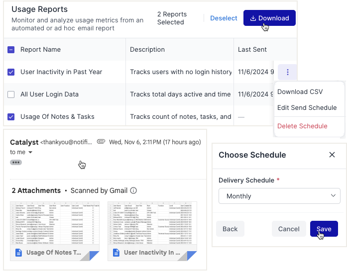Usage reports allow you to monitor and analyze metrics related to your Catalyst users' platform usage. These insights help you better understand team productivity and adoption, enabling you to drive more efficient operations.